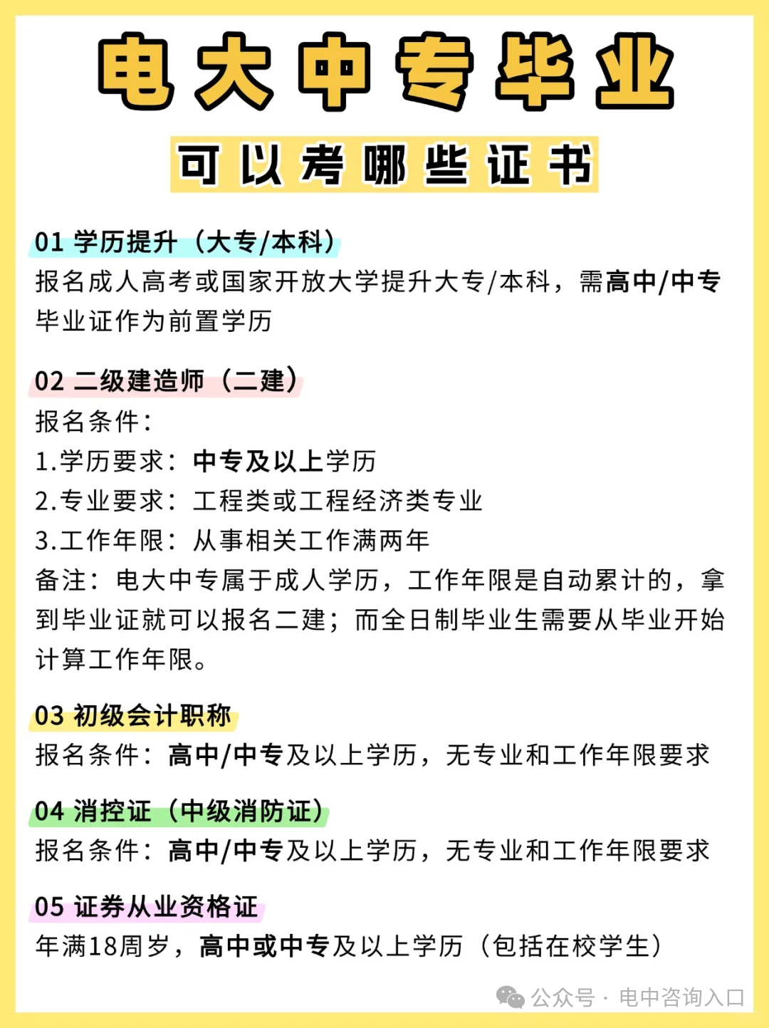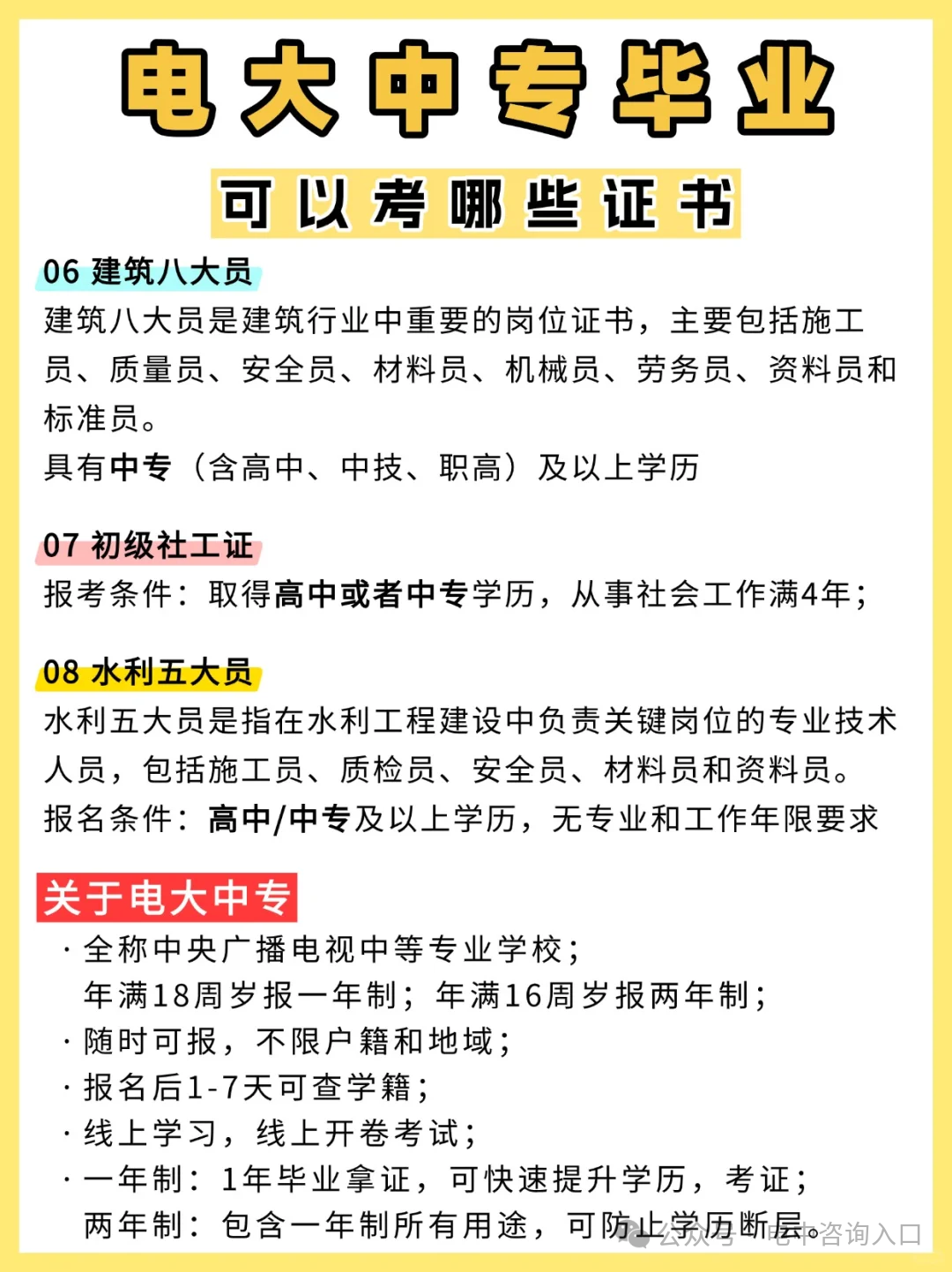 🎓 电大中专毕业的小伙伴们看过来!无论你是想提升学历还是考取职业证书,电大中专都能帮你实现!👇 🌟 学历提升 想读大专/本科?电大中专毕业证是你的敲门砖!报名成人高考或国家开放大学,轻松提升学历! 🏗 二级建造师(二建) 中专学历+工程类专业+2年工作经验,电大中专毕业就能报!工作年限自动累计,拿证快人一步! 💰 初级会计职称 高中/中专学历就能考,无专业和工作年限要求,会计小白也能轻松入门! 🔥 消控证(中级消防证) 中专学历就能报名,无专业和工作年限限制,消防行业必备证书! 📈 证券从业资格证 年满18岁,中专学历就能考,金融行业入门必备! 🏢 建筑八大员 施工员、质量员、安全员……中专学历就能报名,建筑行业必备证书! 👩💼 初级社工证 中专学历+4年工作经验,社工行业入门必备! 🌊 水利五大员 中专学历就能报名,水利工程关键岗位证书! 💡 关于电大中专 年满18岁报一年制,16岁报两年制 随时报名,不限户籍 线上学习+开卷考试,轻松拿证 一年制快速毕业,两年制防止学历断层 🎉 电大中专毕业证,助你快速提升学历,轻松考取各类证书!快来行动吧!🚀以上是关于中专学历的相关内容,考生可以作为参考,如有学历、报名、条件、时间、专业、院校、费用等问题,可以扫下方二维码免费咨询老师。