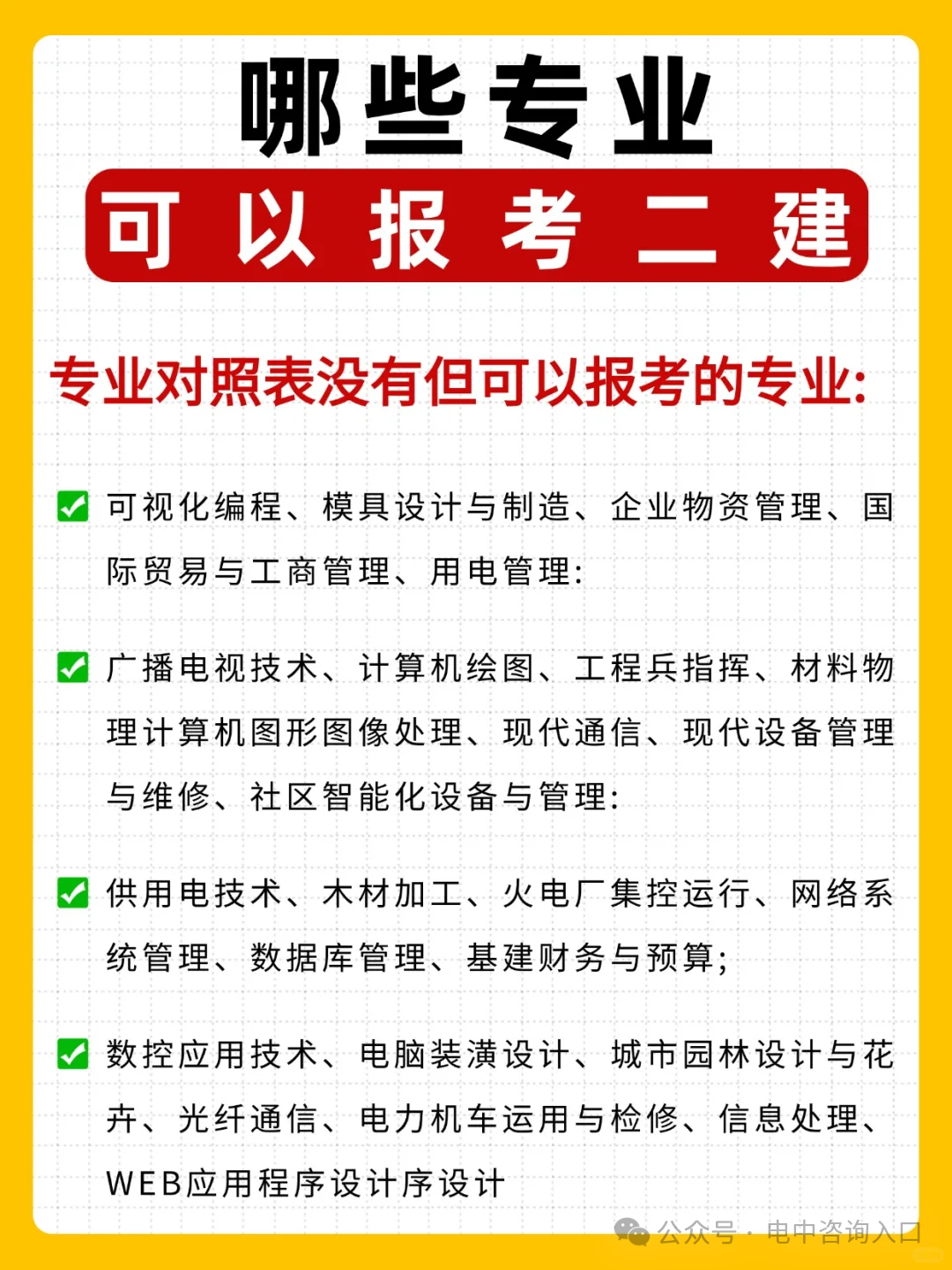 中专及以上学历,工程类及工程经济类专业,从事相关工作满两年。 ✅ 可报考二建的专业范围 根据住建部规定,二建报考需满足工程类或工程经济类专业,或部分省份认可的相近专业,具体分类如下 1⃣ 工程类/工程经济类专业(直接可报) 工学类:土木工程、建筑工程、建筑学、机械设计、电气工程、给排水、测绘工程、水利水电工程等 工程经济类:工程管理、工程造价、建筑经济管理、房地产经营与管理等 其他相关:交通工程、矿业工程、市政工程、环境工程、安全工程等 2⃣ 部分省份开放“相近专业”报考 例如:计算机应用、物流管理、化学工程、园林设计、自动化、电子信息等 注意:江苏、云南、浙江等省份明确放宽专业限制(需搭配更长工作年限) ❌ 不可报考的专业类型(常见例子) 文科类:汉语言文学、英语、法学、历史学等 艺术类:美术、音乐、舞蹈、播音主持等 医学类:临床医学、护理学、药学等 理学类:数学、物理、化学(非工程方向) 其他无关专业:金融学、市场营销、旅游管理、教育学等 ⭕1. 学历、专业不符?电大中专来补! 电大中专一年制,年满18周岁即可报名,不限户籍和地域,选择建筑工程施工等工程类专业,12个月课毕业拿证,同事解决二建报考学历不够、专业部付的问题 ⭕2. 工作年限不够?电大中专也能算! 电大中专属于成人中专,工作年限是自动累计的,毕业就可以报考了! ⭕3. 电大中专的优势 时间短:1年即可毕业,拿证速度快。 费用低:相比其他学历提升方式,电大中专性价比更高,只要一千多。 灵活学习:全程线上学习,不影响工作和生活以上是关于中专学历的相关内容,考生可以作为参考,如有学历、报名、条件、时间、专业、院校、费用等问题,可以扫下方二维码免费咨询老师。