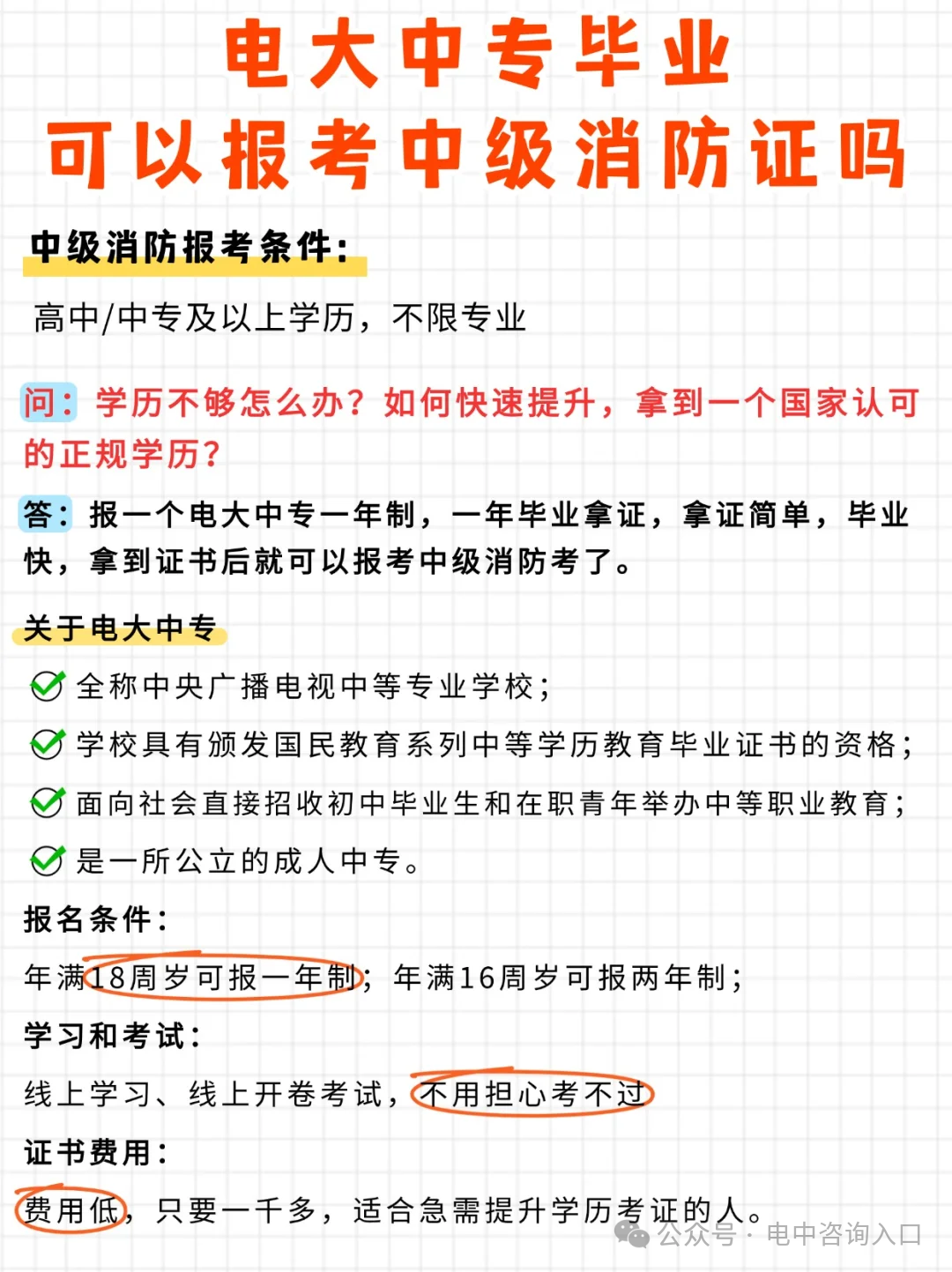 答:报一个电大中专一年制,一年毕业拿证,拿证简单,毕业快,拿到证书后就可以报考中级消防考了。